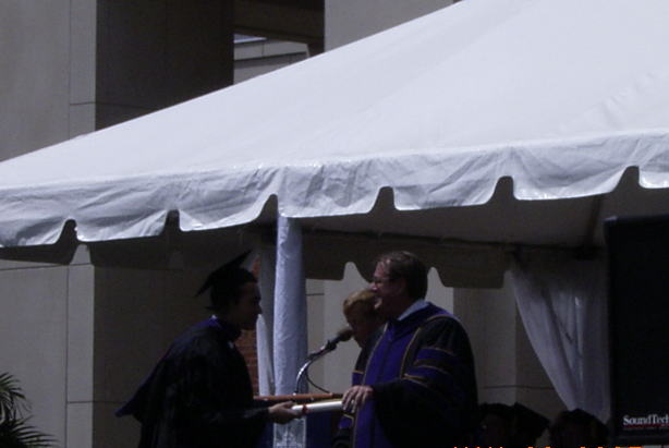 大学本部におけるCommencementのセレモニーに引き続いて行われたロースクールにおけるセレモニーで、法学修士号のDiplomaを取得する小職。 |
